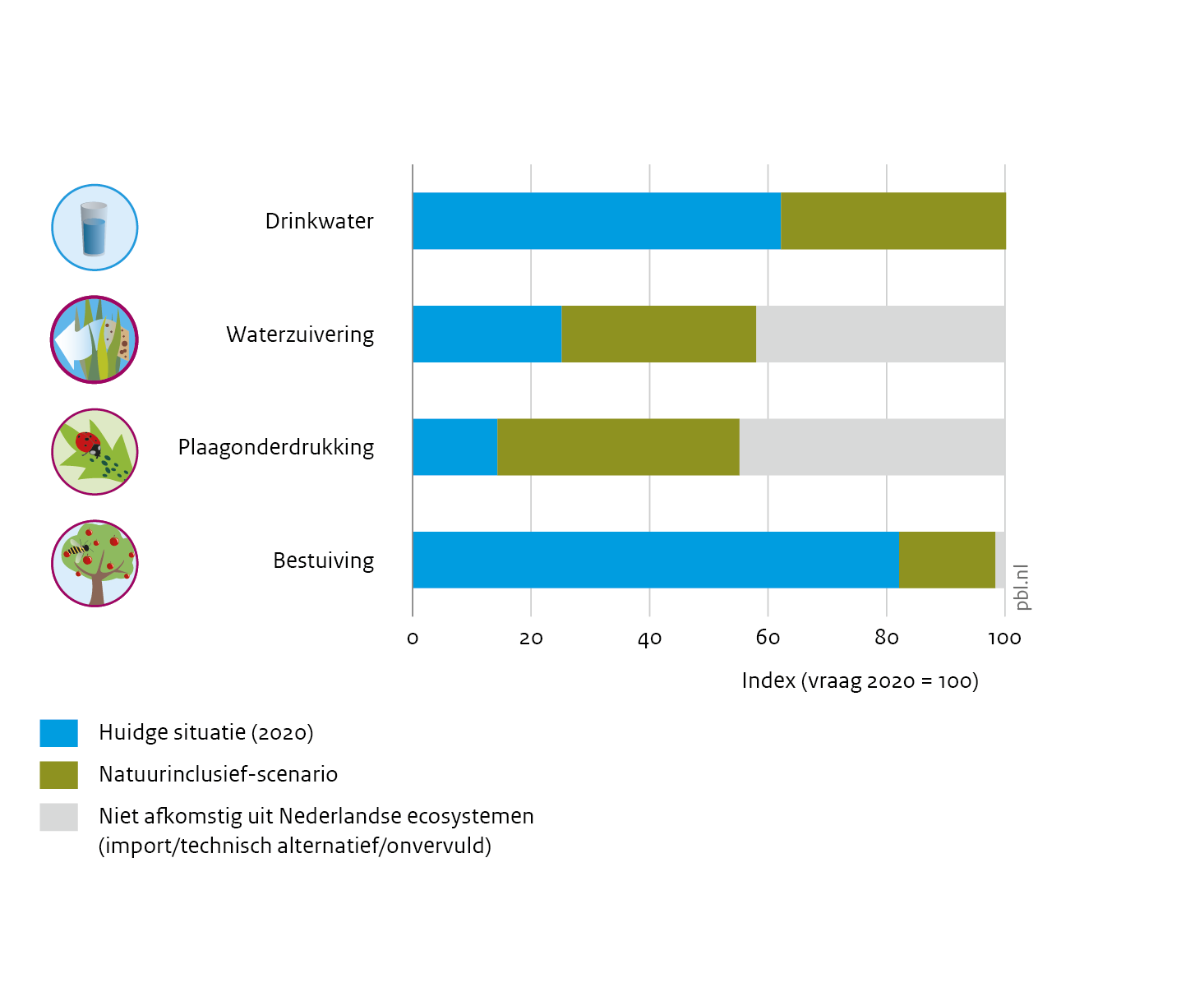 Het is de eerste keer in Nederland dat de effecten van een natuurinclusief toekomstbeeld zijn gekwantificeerd. Eerst is voor de stad, het landelijk gebied en natuurgebieden in heel Nederland ruimtelijk uitgewerkt hoe een natuurinclusieve inrichting er uit kan zien in 2050. Vervolgens zijn de effecten daarvan op zogenoemde ecosysteemdiensten, functies van natuur voor de samenleving, in beeld gebracht. Denk daarbij aan ecosysteemdiensten als verkoeling, luchtzuivering en waterberging. De ecosysteemdiensten die het meeste toenemen zijn: de kwaliteit van het drink- en oppervlaktewater, de aanwezigheid van natuurlijke plaagbestrijders en bestuivers, verkoeling en waterberging in de stad, koolstofvastlegging in veen en bos en biodiversiteit.